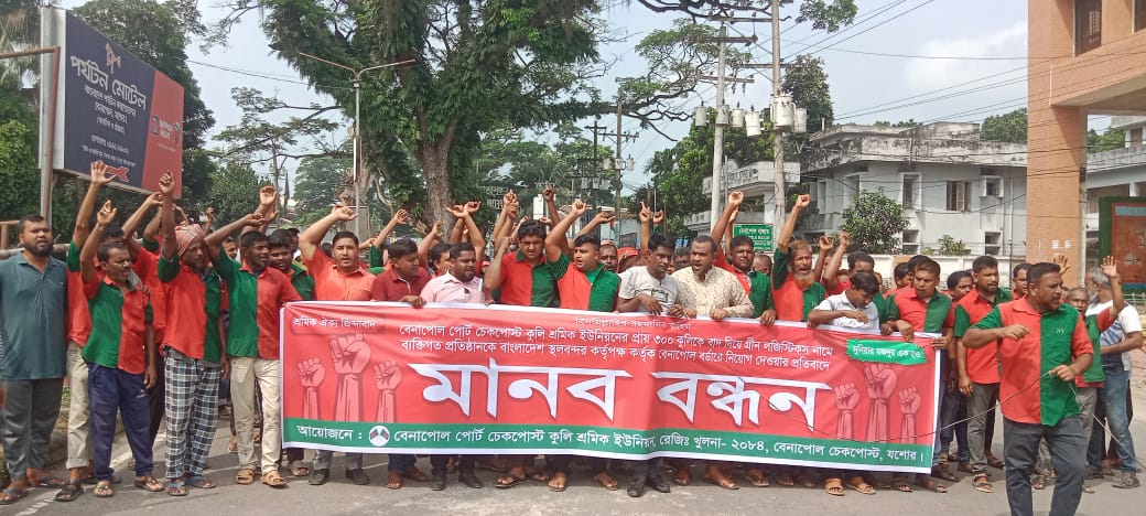 শুক্রবার (১৯ সেপ্টেম্বর) সকাল ১০টা থেকে সাড়ে ১০টা পর্যন্ত বেনাপোল আন্তর্জাতিক প্যাসেঞ্জার টার্মিনাল সংলগ্ন সড়কে এ কর্মসূচি অনুষ্ঠিত হয়। এতে বেনাপোল পোর্ট চেকপোস্ট কুলি শ্রমিক ইউনিয়ন (রেজিঃ ২০৮৪)-এর সভাপতি মোঃ কালুর নেতৃত্বে প্রায় ৩০০ শ্রমিক অংশ নেন। তবে এসময় টার্মিনাল দিয়ে যাত্রী পারাপার স্বাভাবিক ছিল।