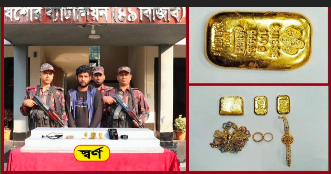 রোববার ( ০৭ ডিসেম্বর) ভোর সাড়ে ৫ টার সময় যশোর ব্যাটালিয়ন (৪৯ বিজিবি) এর একটি টহলদল গোপন সংবাদের ভিত্তিতে কোতোয়ালী থানাধীন দাইতলা ব্রীজের উপর অভিযান পরিচালনা করে ৫১৫.৯ গ্রাম ওজনের ৩পিচ স্বর্ণের বার, ৪ পিচ স্বর্ণালংকার এবং ১পিচ মোবাইল আটক করে।
