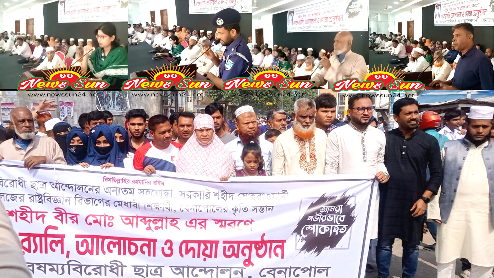 বৈষম্য বিরোধী ছাত্র আন্দোলন,বেনাপোলের উদ্যোগে জুলাই-আগষ্ট/২০২৪ গণঅভ্যুত্থানে পুলিশের গুলিতে নিহত ঢাকা সরোওয়ার্দি কলেজের পলিটিক্যাল সায়েন্স, অনার্স শেষ বর্ষের মেধাবী শিক্ষার্থী বেনাপোলের কৃতি সন্তান শহীদ বীর মো. আব্দুল্লাহ’র স্মরণে বেনাপোলে শোক র‍্যালি, আলোচনাসভা ও দোয়া মাহফিল অনুষ্ঠিত হয়।