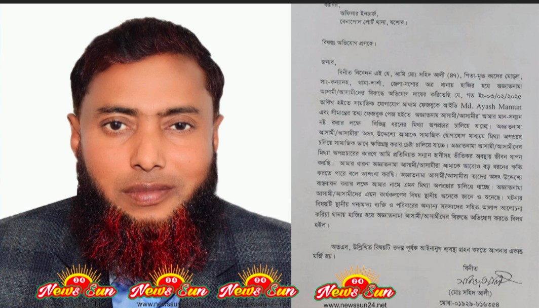 অভিযোগকারী, বেনাপোল স্থলবন্দর হ্যান্ডেলিং শ্রমিক ইউনিয়ন ৯২৫ এর সাধারণ সম্পাদক মোঃ সহিদ আলী বলেছেন,গত ইং ৩/০২/২০২৫ তারিখে Md.Ayash Mamun নামের এক অজ্ঞাতনামা সীমান্তে তথ্য ফেসবুক পেজ হয়তে,আমার মান সম্মান নষ্ট করার লক্ষ্যে, বিভিন্ন ধরনের মিথ্যা অপপ্রচার চালিয়ে যাচ্ছে। অজ্ঞাতনামাদের অসৎ উদ্দেশ্য যে আমাকে সামাজিক যোগাযোগের মাধ্যমে মিথ্যা অপপ্রচার চালিয়ে সামাজিক ভাবে ক্ষতিগ্রস্ত করার চেষ্টা চালিয়ে যাচ্ছে।