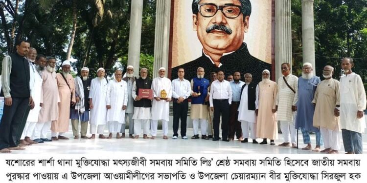 বেনাপোল প্রতিনিধি :: যশোরের শার্শায় বঙ্গবন্ধু ম্যুরালে শ্রদ্ধা নিবেদন করেছেন মুক্তিযোদ্ধা সংসদ ও মুক্তিযোদ্ধা মৎস্যজীবী সমবায় সমিতি লিঃ। সমবায়ের মাধ্যমে সুখী ও সমৃদ্ধ সোনার বাংলাদেশ গড়ার ক্ষেত্রে উল্লেখযোগ্য অবদানের জন্য স্বীকৃতিস্বরুপ যশোর জেলার শার্শা উপজেলাধীন মুক্তিযোদ্ধা মৎস্যজীবী সমবায় সমিতি লিঃ’ কে শ্রেষ্ঠ সমবায় সমিতি হিসেবে জাতীয় সমবায় পুরস্কার ‘গোল্ড ম্যাডেল ও সম্মাননাপত্র’ প্রদান করায় কৃতজ্ঞতা জানাতে এ শ্রদ্ধা নিবেদন করা হয়।