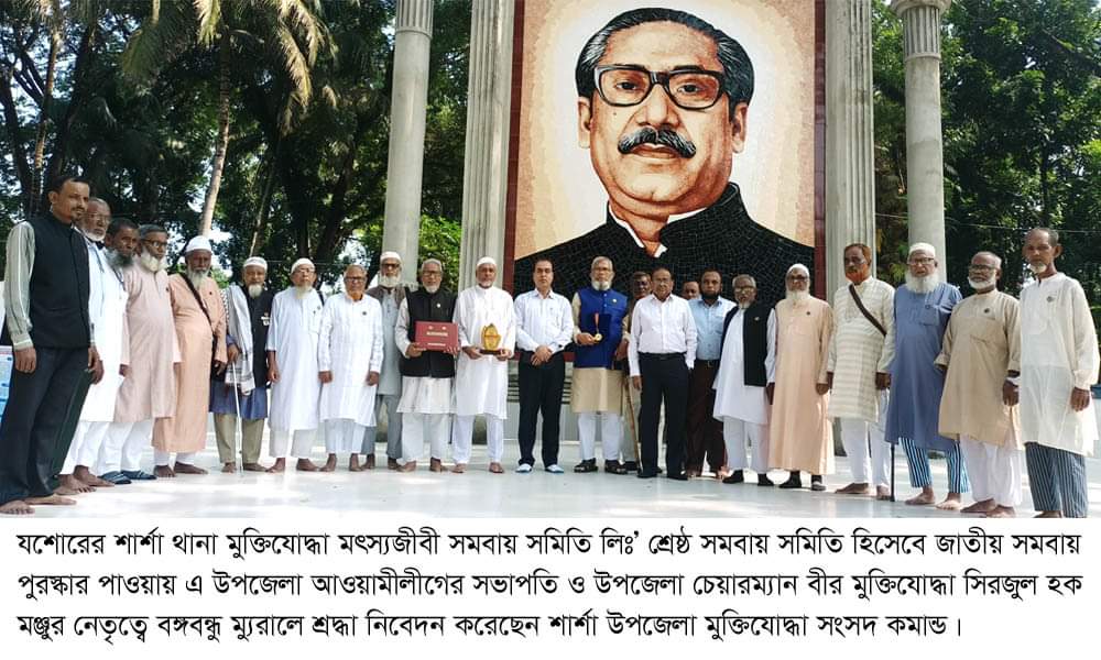 বেনাপোল প্রতিনিধি :: যশোরের শার্শায় বঙ্গবন্ধু ম্যুরালে শ্রদ্ধা নিবেদন করেছেন মুক্তিযোদ্ধা সংসদ ও মুক্তিযোদ্ধা মৎস্যজীবী সমবায় সমিতি লিঃ। সমবায়ের মাধ্যমে সুখী ও সমৃদ্ধ সোনার বাংলাদেশ গড়ার ক্ষেত্রে উল্লেখযোগ্য অবদানের জন্য স্বীকৃতিস্বরুপ যশোর জেলার শার্শা উপজেলাধীন মুক্তিযোদ্ধা মৎস্যজীবী সমবায় সমিতি লিঃ’ কে শ্রেষ্ঠ সমবায় সমিতি হিসেবে জাতীয় সমবায় পুরস্কার ‘গোল্ড ম্যাডেল ও সম্মাননাপত্র’ প্রদান করায় কৃতজ্ঞতা জানাতে এ শ্রদ্ধা নিবেদন করা হয়।